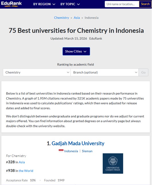 Lembaga pemeringkatan dunia EduRank menobatkan Departemen Kimia, Fakultas Matematika dan Ilmu Pengetahuan Alam Universitas Gadjah sebagai jurusan/departemen terbaik se-Indonesia. Selain itu juga tercatat berada di peringkat 328 di Asia dan 938 di Dunia berdasarkan pemeringkatan EduRank tahun 2026 https://edurank.org/chemistry/id/.